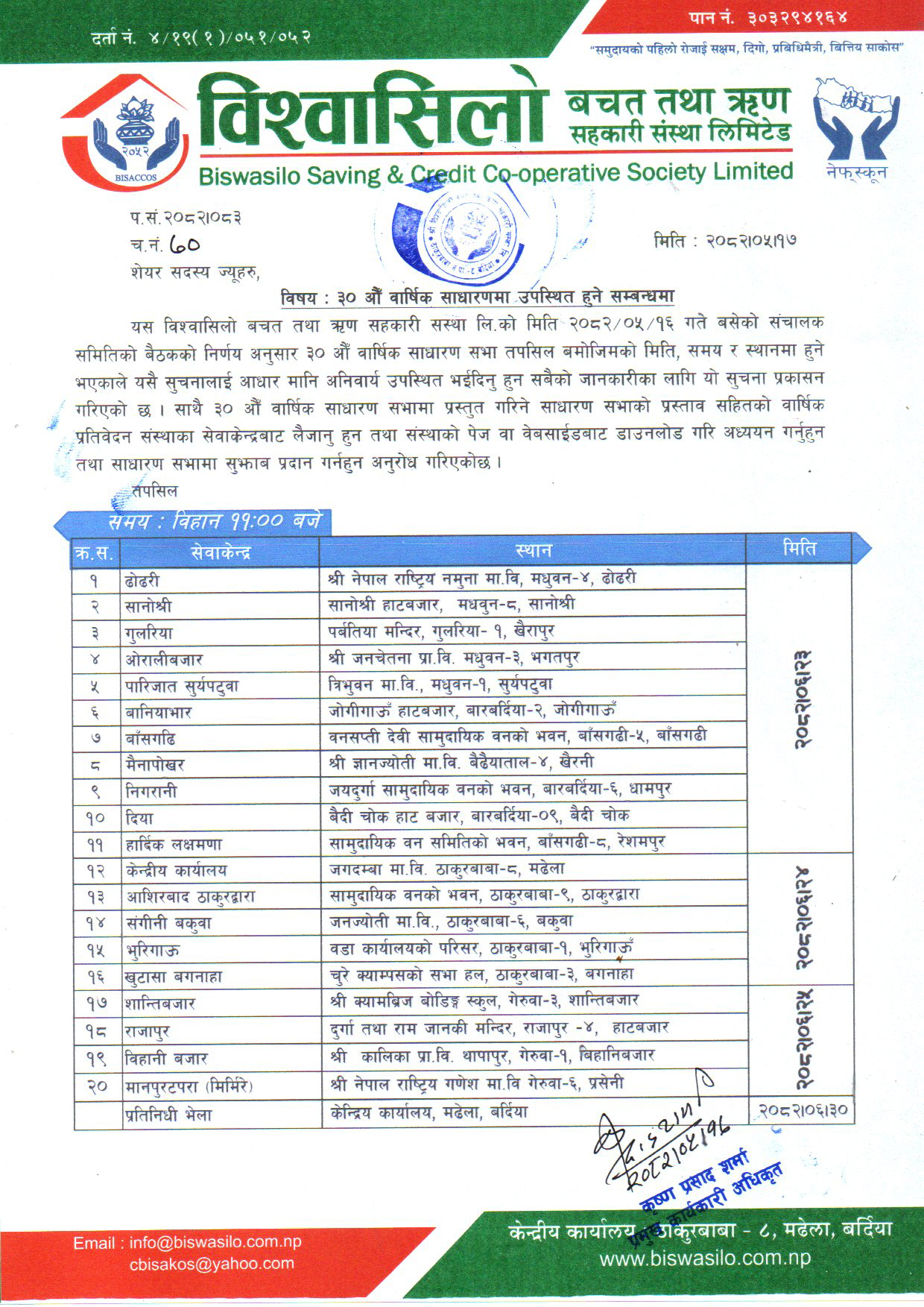३० औँ वार्षिक साधारण सभा हुने सम्बन्धी सूचना